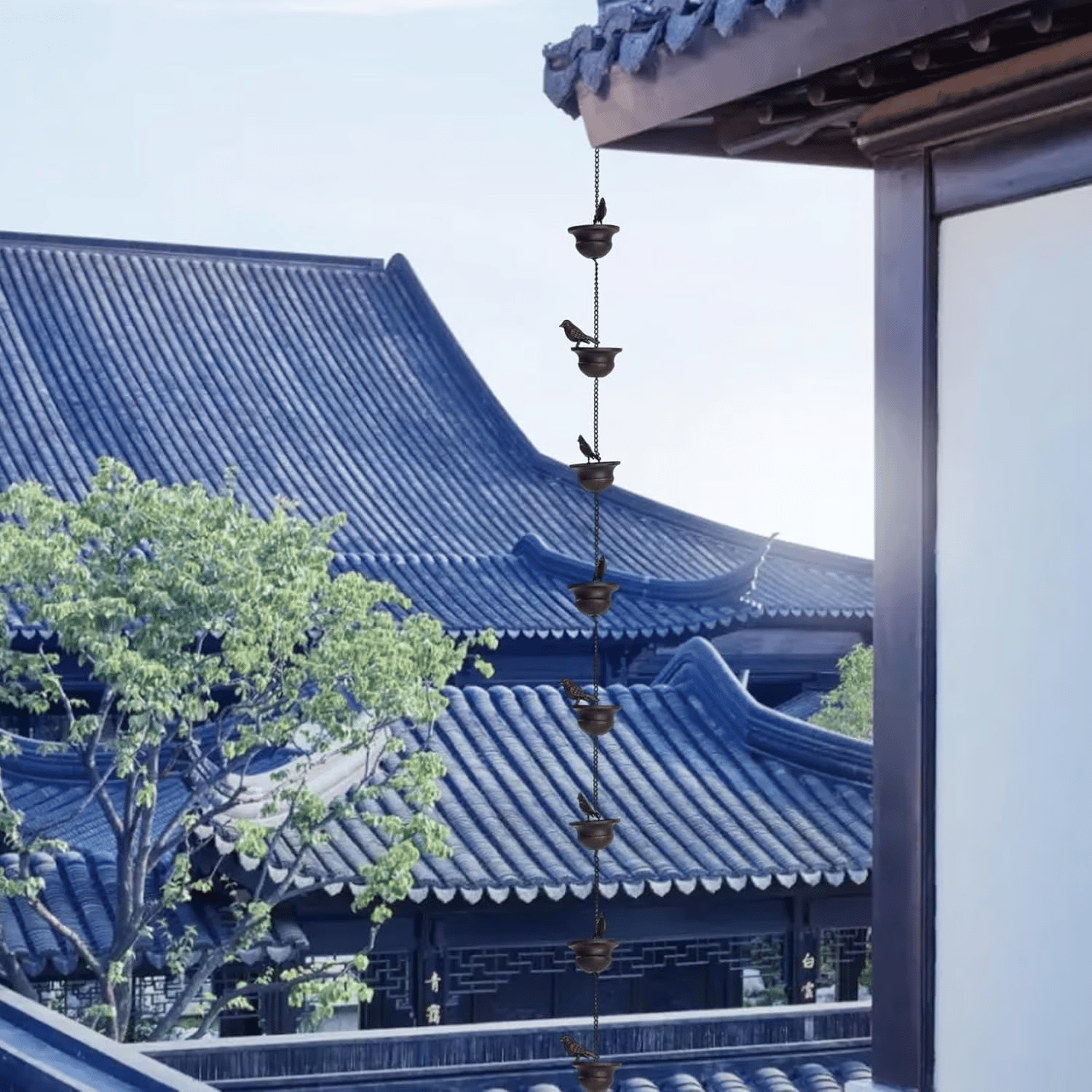 Denne kaskaderende regnkjeden er et fantastisk alternativ til tradisjonelle nedløpsrør. Regnvann renner grasiøst fra fuglebad til fuglebad, og skaper en naturlig fosseffekt som er både visuelt og auditivt beroligende.