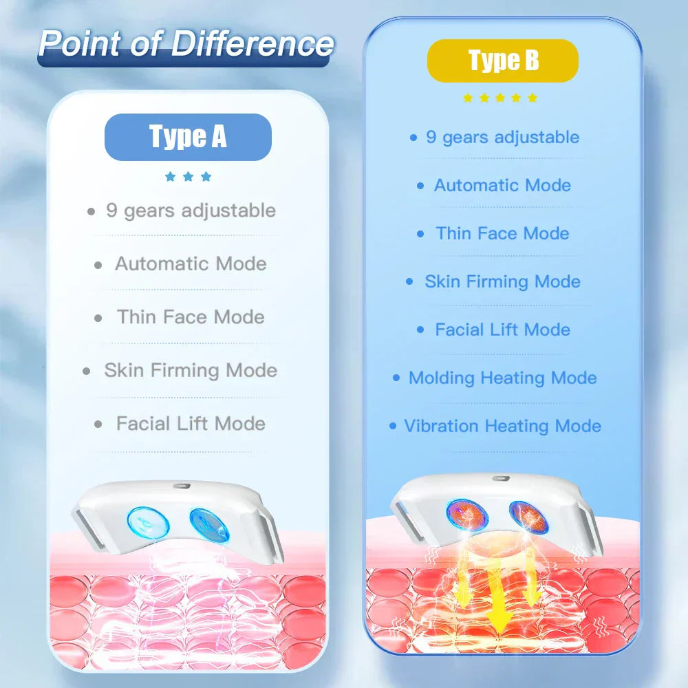 ✅ 5 eller 7 justerbare moduser Velg den perfekte innstillingen for hudens behov: - A-type : 5 sentrale EMS-moduser - B-type : 7 moduser totalt (inkluderer vibrasjon + varme)