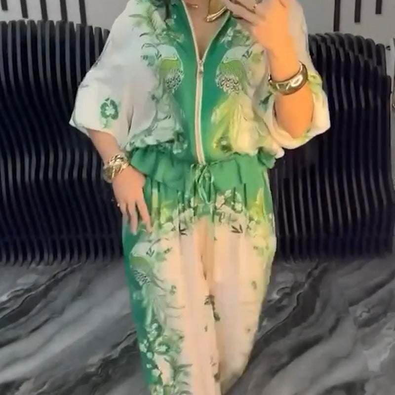 KOMFORTABEL PASSFORM MED STIL: Dette antrekket er designet med en avslappet kimono-topp med ermer og elastiske bukser i midjen, og sikrer komfort hele dagen uten at det går på bekostning av mote – perfekt for avslapning eller utflukter.